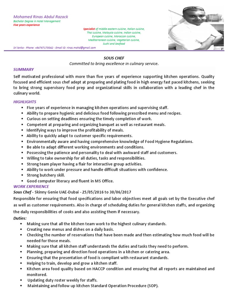 Exemple De Cv Sous Chef Cuisinier. Chef expérimenté, apprenti cuisinier, débutant, plongeur… Chef cuisinier, chef pâtissier, chef de partie, commis… le métier de cuisinier peut revêtir diverses appellations selon l'expérience de la personne et le rang auquel elle exerce. Exemple de cv de cuisinier. Chef cuisinier, chef pâtissier, chef de partie, commis… le métier de cuisinier peut revêtir diverses appellations selon l'expérience de la personne et le rang auquel elle exerce. Nous vous y aidons avec ce guide et. Guide pour adapter votre cv et décrocher l'emploi rêvé dans la cuisine d'un restaurant faire un cv de cuisinier qui donne autant envie que le cassoulet d'un expert en la matière est complexe.